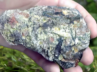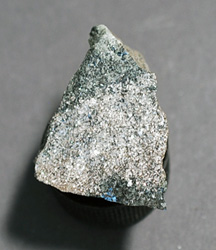 Chalkopyrite med inslag av svavelkis, bornit (det bruna), vidare finns zinkblände och gedigen arsenik. Storliden gruvan, Lappland, Sverige. Collection & photo ©2005 Geonord. Finns att köpa på Scandinavian Minerals.Chamosit, gröngrå eller grönsvarta, täta eller oolitiska massor med komplicerad sammansättning, i huvudsak ett vattenhaltigt silikat med Fe och Al.