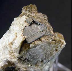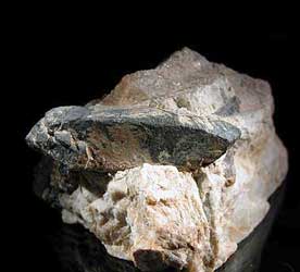 Columbit. (Fe, Mn)Nb2O6, bildar ofta rektangulära och tjockprismatiska plattor med svart till grå färg.