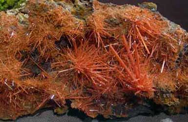Finns att köpa på Scandinavian Minerals.Crocoite. Är en bly-kromat med formeln PbCrO4. Finns inte i Sverige, men vacker att ha i utställningen.