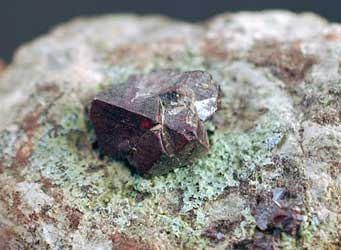 Cuprit. Cu2O. Kopparoxid. Kristallformen kan vara oktaedrisk eller cubisk och färgen är ofta mörk rubinröd. Omvandlas till grön malakit. Ovanlig i Sverige. Stora mängder massiv cuprit med mikrokristaller 10X och malakit kunde hittas i Viskaria- och Pahtohavare gruvorna i Kiruna för länge sedan (1993).