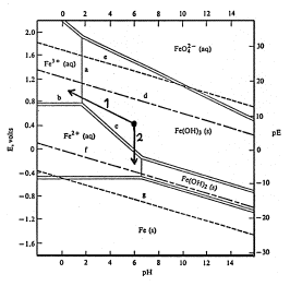 2/ Sänka oxidationstalet med något reduktionsmedel så att det fasta trevärda järnet övergår i vattenlösligt tvåvärt dito. En hög koncentration av den lösliga Fe2+ jonen är stabil även vid neutralt pH till skillnad från det trevärda järnets motsvarighet (pil 2 i fig 1).