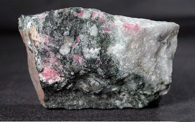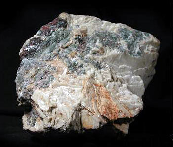 Willemit, grönt och calcit, rött, Sterling Hill Mine Franklin, NJ, USA.