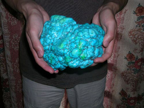 "Turkos" på 2,5 kilo. Äkta? Nej. Färgad howlit. "Turkos" på 1,2 kilo. Äkta? Nej. Färgad magnesit.Det enklaste sättet att avslöja om det är äkta är att med bomull och lite lösningsmedel ex alkohol eller aceton knida på ytan och om färgen släpper så är det ett falsk mineral.