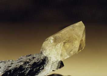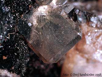 Baryte on biotite scarn, Grängesberg mines, Dalarna, Sweden. Size of the crystal 15 mm. © 1999. Torbjörn Persson. Geonord Photo Archive of Minerals. |