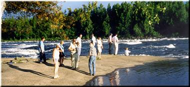 Fika vid Österdalälven.Måndagen den 25/6 vaknade vi till en vacker solig morgon med blommande ängsklockor längs dikeskanterna och på lägdorna runt vandrarhemmet. Vid 8-tiden startade vi vår fortsatta färd mot alla stenar som bara låg och väntade på vår ankomst. Vägen gick först genom det skogiga gränsområdet mellan Dalarna och Värmland. Leif och Sven-Erik hade då liksom under hela resan synpunkter på röjning och skogsvård, så fort dom såg en träddunge.