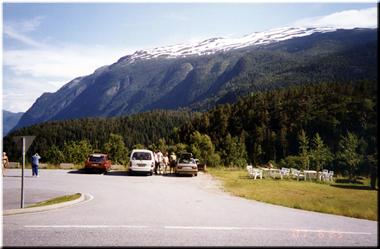 Rastplats på vägen mellan Drammen och Dalen.Efter Kongsberg började det bli riktigt härlig norsk natur med svindlande serpentinvägar, djupa grönskande dalgångar och höga snöklädda fjäll. Vi njöt i fulla drag av alla dessa skönhetssyner på gränsen till Hardangervidda. I Eidsborg en knapp mil före Dalen, som låg i en djup dalgång vid sjön Bandak, gjorde vi en kort paus vid ett vackert pensionat ganska högt uppe på fjället. Vi åt god norsk glass och beundrade den undersköna utsikten över fjäll och dal. En bit ned på serpentinvägen mot Dalen upptäckte Marja-Lena, att hon saknade sin plånbok med reskassan. Vi återvände upp till pensionatet, och Marja-Lena hittade sin plånbok på bänken där hon suttit och ätit sin glass. Lättnad hos alla i bussen! Vi tog oss också tid att på nedvägen bese Eidsborgs kirke, en välbevarad mycket vacker stavkyrka från 1200-talet. Tyvärr var den låst, så vi fick bara se den utvändigt. Särskilt Pauli gladdes åt detta kyrkostopp. Han tittar gärna på kyrkor, när han är ute och reser.