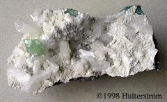 | Grön apophyllit och stilbit, Poona, Indien. ©2000 GeoNord. | Okenit och stilbit, Poona, Indien. ©2000 GeoNord. |