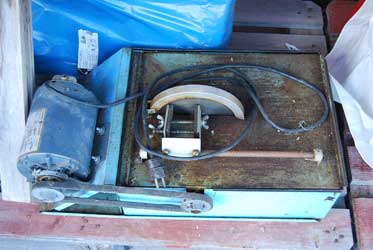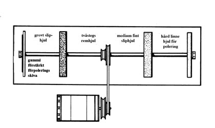 Den till vänster användes för att förpolera (korn 600), nästa är till för grovslipning (korn 80), nästa på andra sidan motoraxeln för finslipning (korn 220-360) och till höger ytterst för slutpolering (korn 3.000).