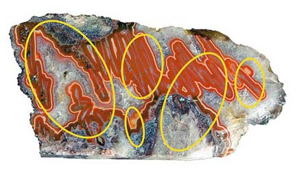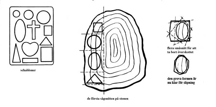 Det finns färdiga cabochonmallar i aluminium. Lägg mallen på den sågade stenen och rista in den eller de cabochoner som du tänker såga fram. Stenens mönster och färg styr ditt val. Med diamantsågen gör man först ett avlångt snitt och därefter tvärsnitt för varje delprojekt.