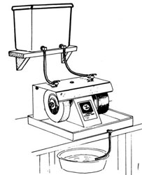 För att du inte skall få stenlunga finns en vattenbehållare som fuktar sliphjulen och vattnet binder dammet. Stendammet kan också förstöra kullagren i axeln.