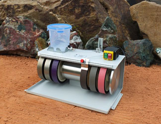 En cabochonmaskin kan se ut på många olika sätt. Som nedan med två sliphjul. En fastsittande grov kiselkarbidhjul korn 80 till vänster eller den kan också vara ett diamanthjul. Till höger har man ett expanderhjul i gummi som man monterar på olika slipskivor för finslip, förpolering och polering.