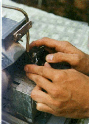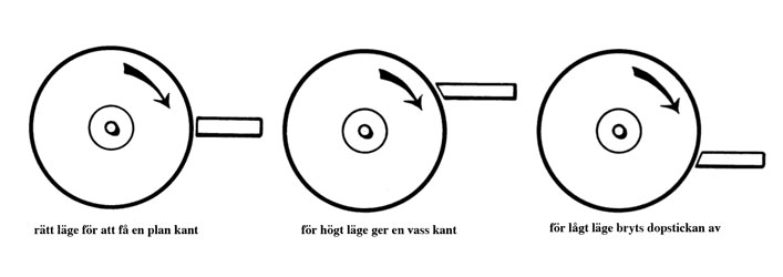 Vid cabochonslipning är det i praktiken omöjligt att hålla fast stenen med fingrarna. Försök hålla stenen strax ovanför axeln. Om den är för högt placerad hugger sliphjulet och om den är för lågt bryts den loss från doppstickan som du håller i. Du får också en sned kant.