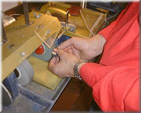 Att slipa stenen på fri hand kan vara riskfyllt. Man kan lätt skada fingrarna och naglarna. På bilden ovanför i mitten har man monterat stenen på en doppsticka av trä. Stenen är fastmonterad på stickan med stenlack/vax eller snabbstelnande epoxi. Man har nu full insyn och kontroll över stenen och sliphjulet. Hur det går till finns här: https://www.youtube.com/watch?v=aekPcGp5e5Y