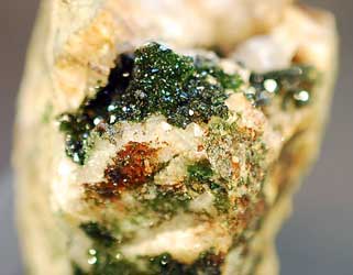 Libethenite, Miguel Vacas Mine, Conceição, Vila Viçosa Portugal, ©2006 Geonord Photo Archive of Minerals. Size 3x4 cm. |