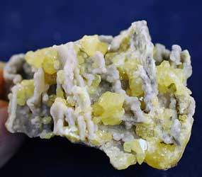 Sulphur on Barite, Machow, Polen. ©1979 Geonord Photo Archive of Minerals. 5x4 cm. We have a large stock. |