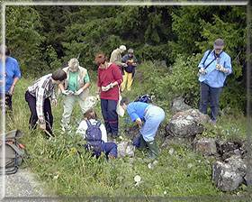 DEN 1 SEPTEMBER 2001 DEL II Exkursionen fortsatte sedan till typlokalen för alnöit. Sven berättade att alnöit består av stora tavlor av glimmer (flogolit) i en tät kalcitförande grundmassa. Tyvärr har den lilla vägskärningen och hällen börjat växa igen och om området inte röjs upp kommer bara skylten vittna om att där finns något intressant. Färden gick sedan vidare till "Bolidenbrottet" vid Hörningsholm. Platsen är en geologisk lokal bestående av i huvudsak nefelinsyenit. Platsen är en ypperlig parkeringsplats om man är intresserad av gå ca 200 meter mot Stornäset och på andra sidan vägen hittar man bearbetade block och hällar innehållande gul cancrinit. Aktiviteten blev stor och Görans slägga kom till användning. Alla bearbeta friskt stora som små block och ingen gick lottlös från lokalen.