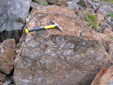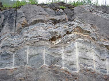 Bergsskärning nära Kåtaviken. Storakersvattnet, Norge bjöd på busväder och regn. Burrrr.Den tredje dagen började bra, med regn. Vi åkte mot utlandet, sade mamma och pappa. På vägen letades det febrilt efter ett block med turmaliner i, men det hittades inte. Däremot såg vi på kalkstensblock vid kåtaviken, och lite längre fram såg vi på en randig vägskärning. Det var där som det riktigt roliga började. Helt plötsligt hade jag Marjatta bredvid mig i baksätet. Hon var så snäll och gav mig godis och kramar, som tack pussade jag henne ordentligt. Efter ett tag var vi helt plötsligt i utlandet och letade sten. Stället heter Storakersvattnet och där kunde vi hitta tremolit och hornblände pseudomorfer som vittrat fram ur kalkstenen. Det var inte mycket vatten i sjön så vi kunde gå omkring ganska mycket. Det var synd bara att det regnade. Jag ville i alla fall ta mig ett dopp och smaka på norskt vatten. Det smakade precis som det gör på svenska sidan.
