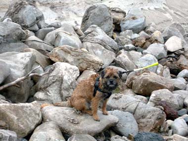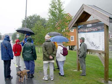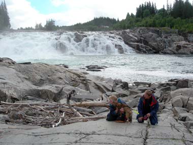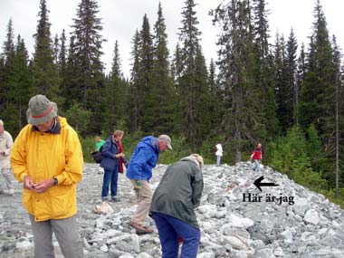 Sjögate i Mosjöen med mera regn. Laxfossen där jag äntligen kan ge Marjatta en riktigt blöt puss.Nästa dag började bra, men regnet ville inte ge med sig, det kom och gick hela dagen. Vi körde mot Mosjöen. Där gick vi längs Sjögate. Det regnade så de flesta gick in på ett konditori. Jag får inte gå in där, så mamma, pappa och Marjatta fortsatte att gå med mig längs gatan. Det regnade av och till så det kändes kallt. Mamma och pappa sa att de började bli hungriga också, så vi satte oss i bilen och for vidare. Vi stannade vi laxfossen och åt lunch. Sedan fortsatte vi mot Sverige. Vi stannade vid ett stenbrott där man bryter kvartsit, sade pappa. Sedan stannade vi och drack kaffe på en trevlig rastplats vid Rössvattnet. En bukt längre fram stannade vi igen och alla gick ner till stranden för att leta stenar. Här kan man hitta rökkvarts om man har tur säger pappa, som hittade en fin bit. Det var när vi gick här på stranden som resten av flocken kom ifatt oss. Vi kunde nu åka vidare till den plats där Torbjörn väntade på oss. Han skulle visa oss var man kunde gå som spindelmannen. Som vanligt så försökte Torbjörn gå ifrån mig, men inte skulle några stenblock i en rasbrant hindra mig från att hinna ifatt min bästa vän. Mamma pustade och undrade om det var så klokt att gå upp mitt i rasbranten, men hade min vän Torbjörn gått där så skulle jag också gå där. Väl uppe så kunde mamma pröva på att gå som spindelmannen på den vittrade olivinen och de som tagit sig upp, pappa, mamma, Staffan, Leif, Marjatta och Tore kunde se hur olivinen ser ut när den är vittrad. Det knackades också en del prover på vittrad och icke vittrad olivin.
