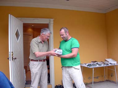 Thore överlämnar en present från föreningen till Chris. Talkgruvan i Altermark med massa spännande stenar.Jag fick också träffa andra medlemmar i Chris flock, hans fru Elisabeth och två andra medlemmar i Rana föreningen. Den ena heter Eli och hon känner mamma och pappa sedan tidigare.