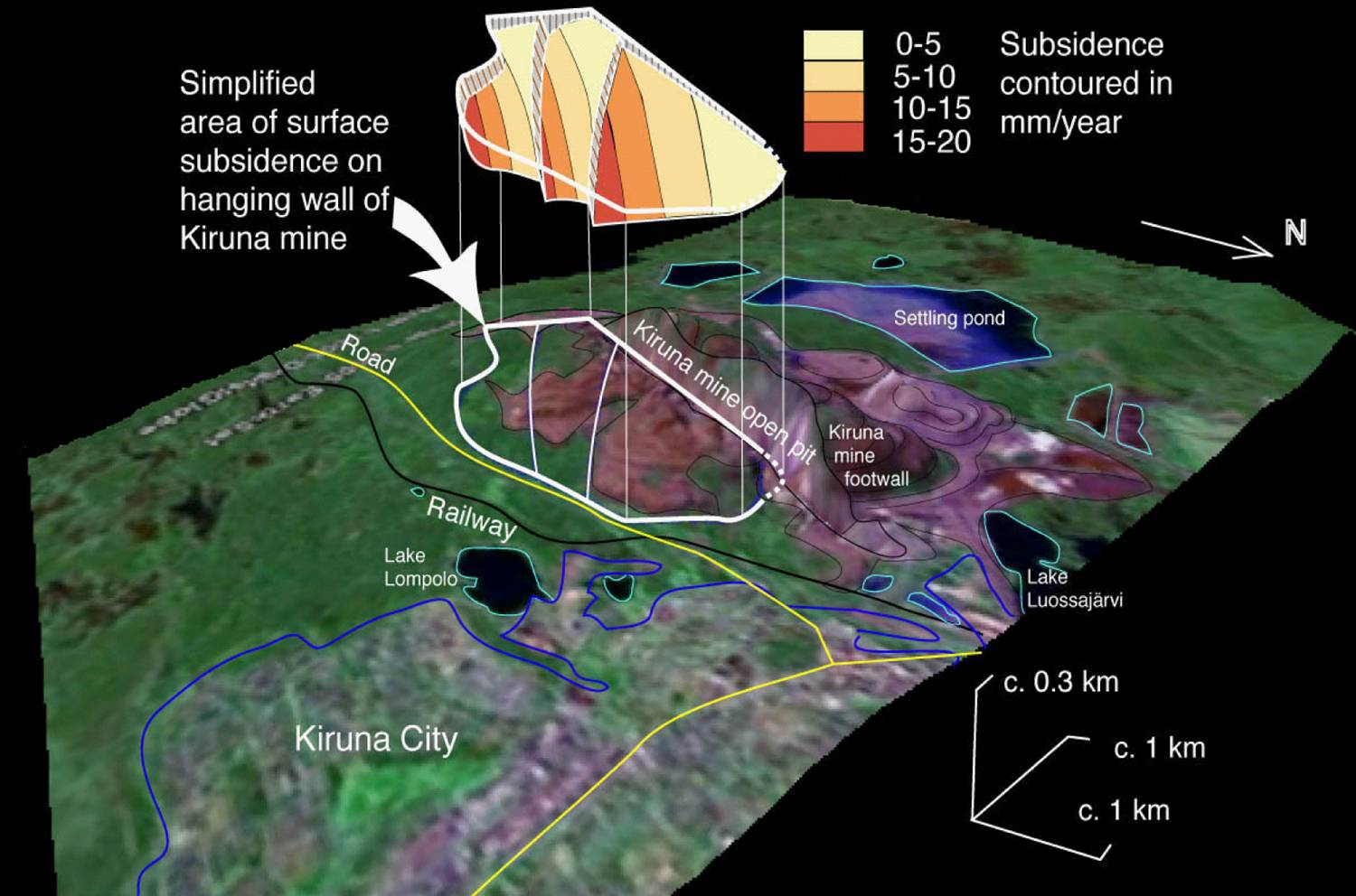 3 Några fägband, om än inte lätt att se på denna interferometribild över Kirunagruvan, visar på sjunkande och roterande bergrörelse. Som orientering är bland annat järnväg inritad i vitt med tvärstreck, norr är rakt uppåt. De röda strecken är hjälpstreck för profilmätning. Resultatet har tolkats till en ny bild över Kiruna. För att se bilden, 140 kB, , klicka här.